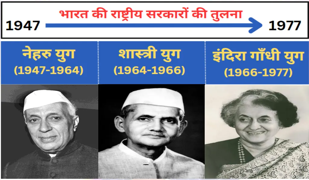 इसी प्रकार स्वतंत्र भारत की राष्ट्रीय सरकारों की तुलना एक ही शासनकाल के विभिन्न पहलुओं के सन्दर्भ में की जा सकती है। जैसे, नेहरू काल (1942-1964) अथवा इन्दिरा गाँधी (1966-1977) तथा (1980-1984)