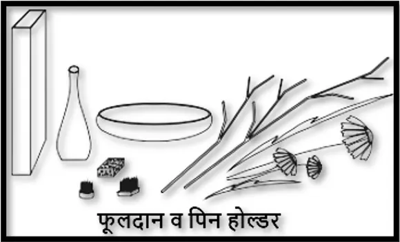 - एक भारी धातु के आधार पर लगी हुई लोहे की कीलों को पिन होल्डर कहते हैं। इसकी कीलों को जंग रहित, पास पास लगी हुई और इतनी लम्बी होनी चाहिए ताकि फूलों के तने और पत्तियों को उन पर टिकाया जा सके।